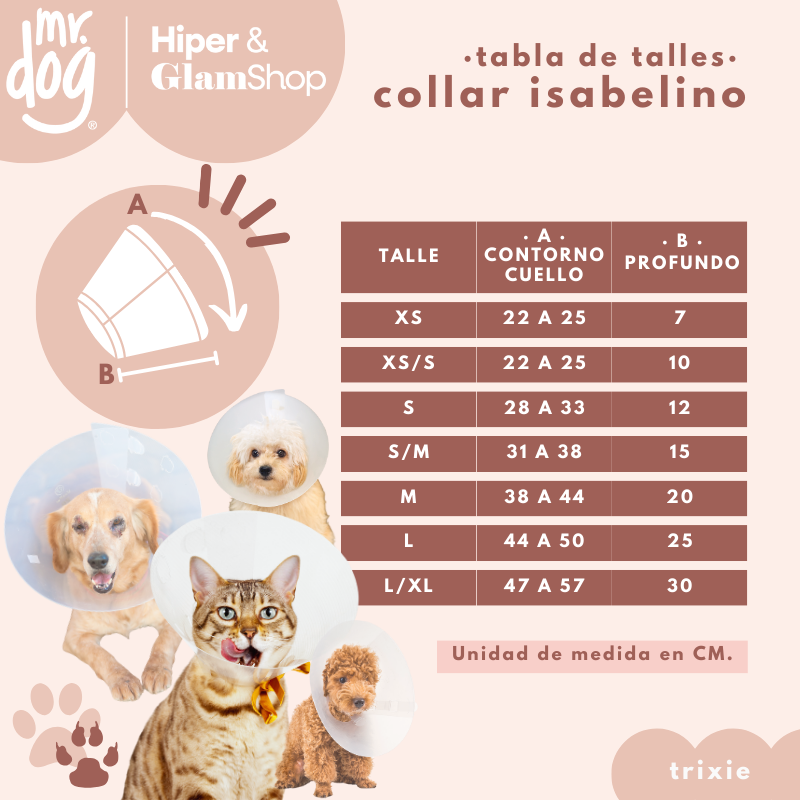 El collar isabelino para perros y gatos es un método físico que evita o dificulta que los animales puedan tocarse heridas, erupciones, suturas post-quirúrgicas, sondas, vendajes o bien se dañen por mordiscos o un lamido excesivo.